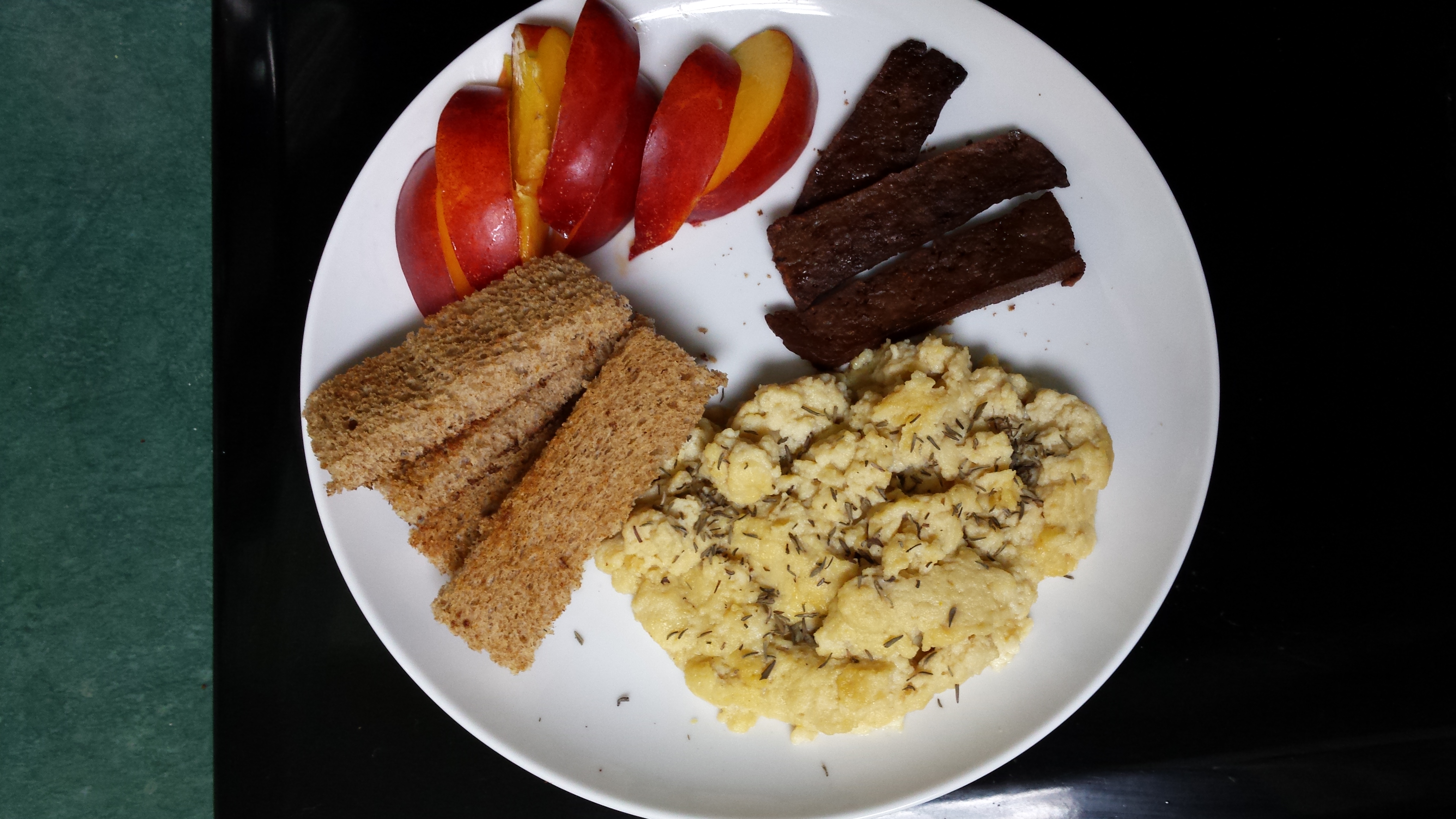 Slide scramble out of pan onto a plate. The manufacturer’s instructions say to microwave the scramble for a firmer texture, but I thought the texture was good and opted not to microwave it. I served the scramble sprinkled with dried thyme, salt, and pepper along with toast, tofu-bacon, and sliced nectarine.