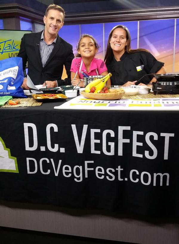 Even before VegFest started, I had an exciting week helping spread the word about the event. On Monday, September 28 I demoed Fruit-Filled Crepes on ABC 7’s Let’s Talk Live! Here I am with host Kidd O’Shea and my co-star Maya. You can also watch the video (starting at the 47:28 mark).
